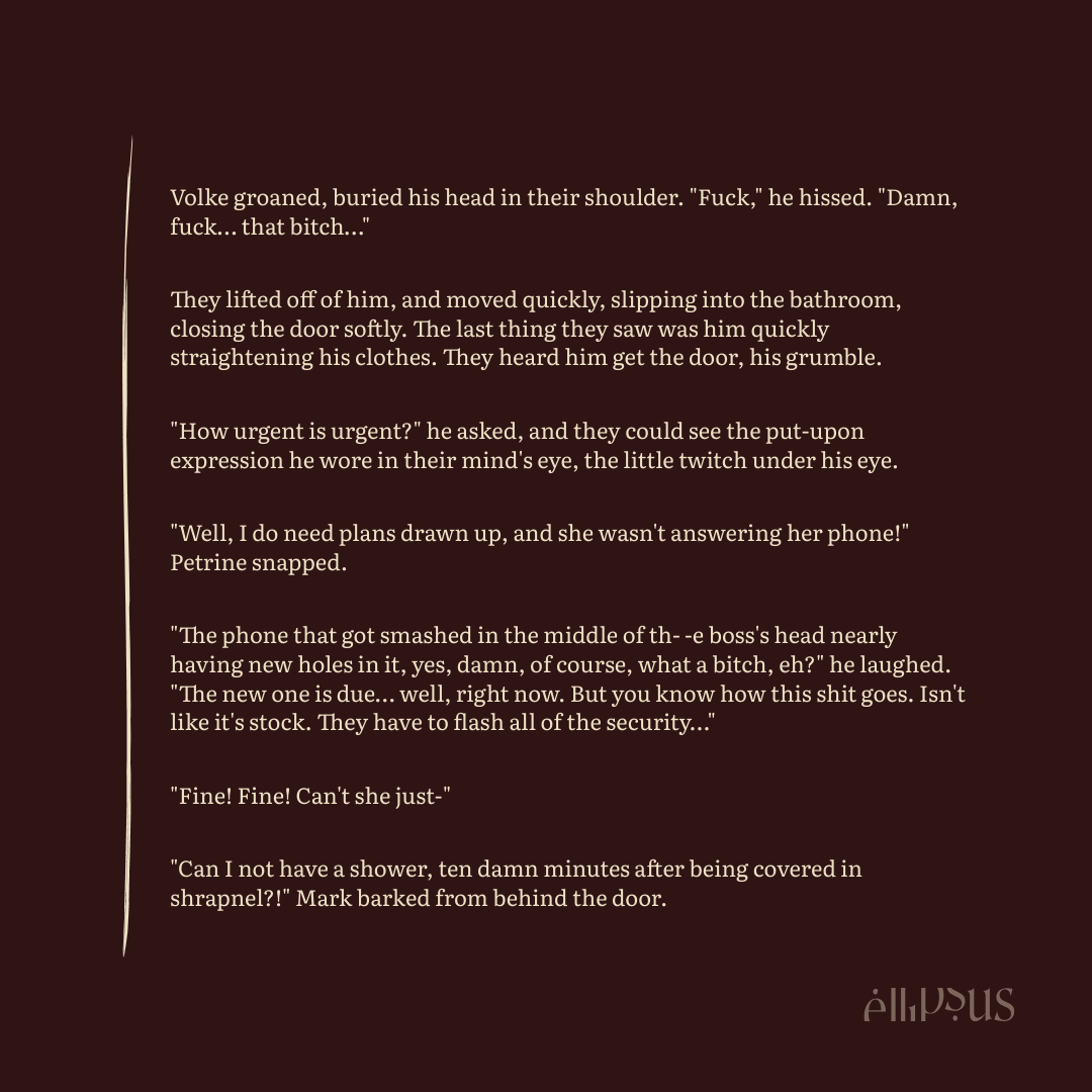 Mostly not a lie. He'd kissed with such a heady decadence that for a brief few seconds, as starved for physical intimacy as they were, they'd kissed as though to devour him, but they had cut that off, excused themself. There had been no grace to it as they'd hurried off to the bathroom. To clean up, clean the blood off, supposedly. It was still spattered on them as they stood over the sink.