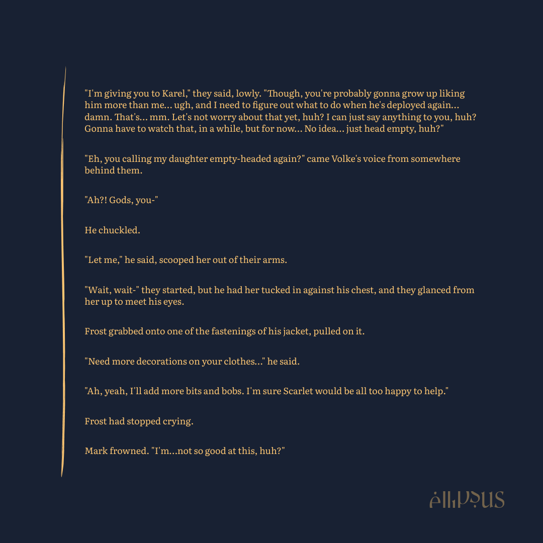 "… You could say that," they said, stepping back into his radius, at each point far too aware of how quickly he could close the distance. "On my side, though, it seems."